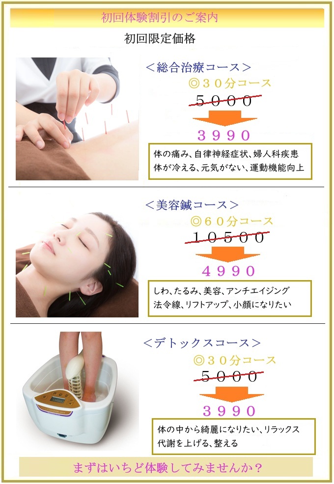 デトックスコースで良くないものを出して、鍼灸・整体で体を整え、栄養や食事で良いものを取り入れることを提案いたします。